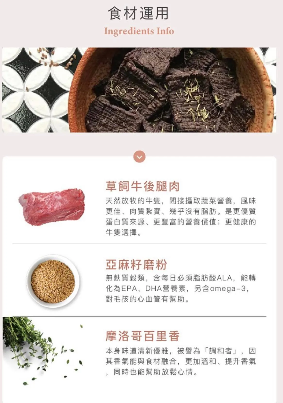 草飼牛後腿肉、摩洛哥百里香、亞麻籽磨粉