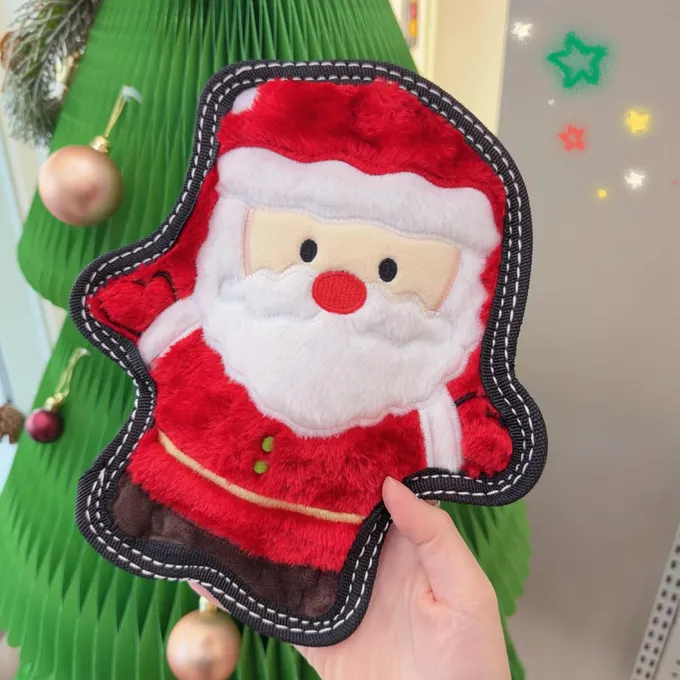 這款到貨比較晚 很靠近聖誕節了做免運活動給大家買單一隻就享免運費唷購物車一起結帳也是不用運費現貨大約十隻左右 售完斷貨~約21*25公分扁扁一個完全沒有棉花!超讚身體是長形大管啾響徹雲霄 小狗最愛的那種全牛津布包邊耐咬聖誕老公公造型最應景顏色飽和鮮明