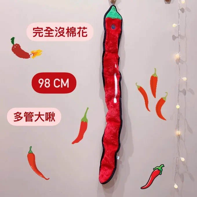 98公分超長辣椒全系列最長就是它!🌶️ ***NEW***大紅辣椒大辣的那種!完全沒棉花 咬爆家裡也不會像戰場全包邊耐咬材質 耐啃耐磨內建六顆大管啾 響徹雲霄特別推薦給多犬家庭玩拔河 或活潑狗狗做互動唷