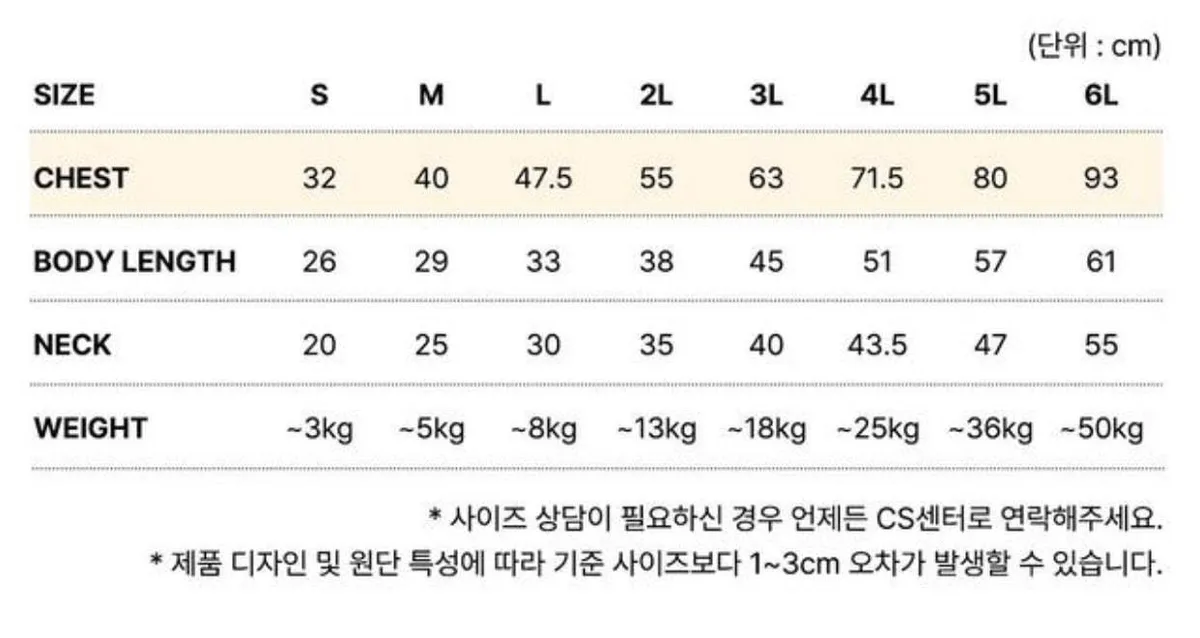 以上數字都是平舖一圈的公分數,體重和品種不是拿捏尺寸的唯一考量,請實際測量狗狗的「胸圍、頸圍、背長」並考慮毛量後,再按照表格拿尺寸