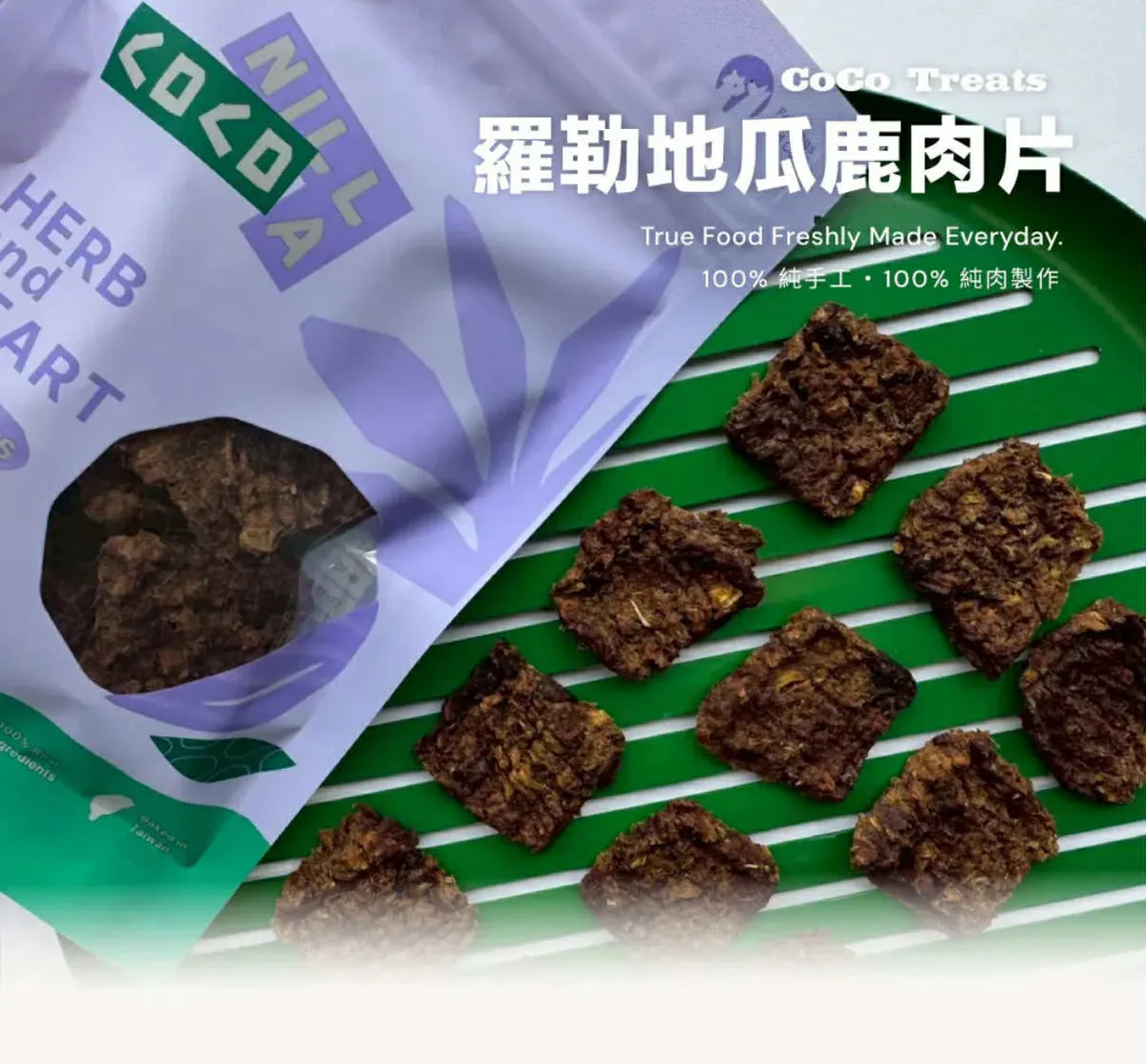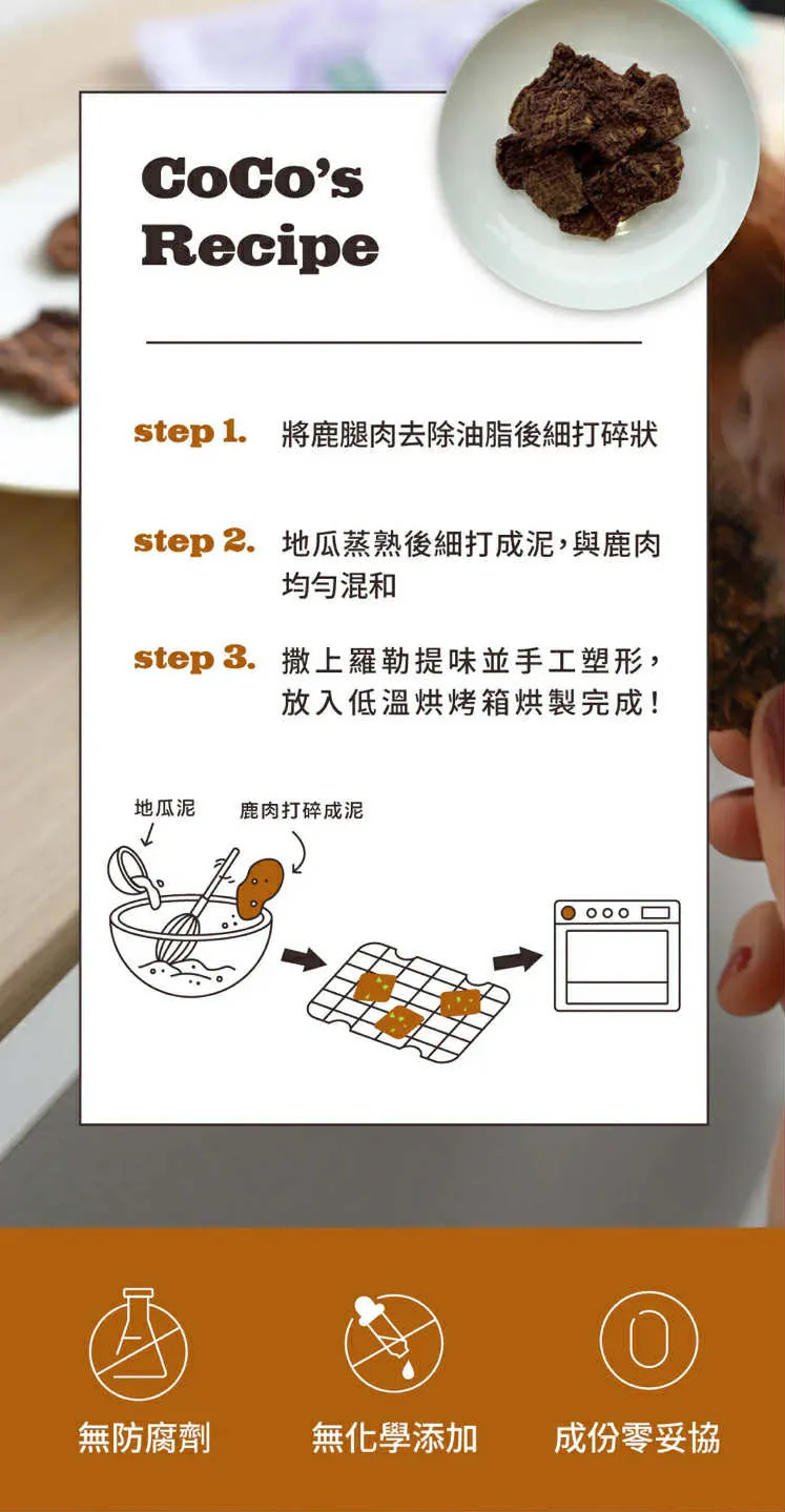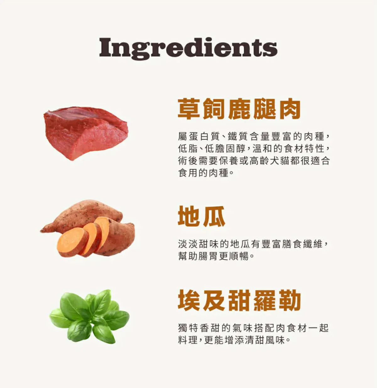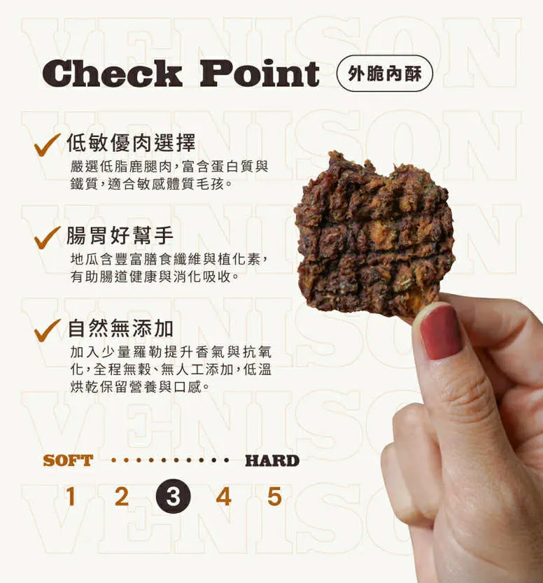 嚴選低脂鹿腿肉,高品質蛋白質與鐵質,是低敏的優質肉種選擇,帶給毛孩優質的營養補給。地瓜則含有豐富的膳食纖維與天然植化素,不僅幫助腸胃蠕動,也能增進腸道菌叢品質。搭配少量羅勒,溫和提味且具天然抗氧化成分,為零食增添層次香氣與營養價值。全程無穀、無人工添加物,透過低溫烘乾保留營養與口感,是毛孩日常補充營養的天然小點,一口酥脆,吃進健康。