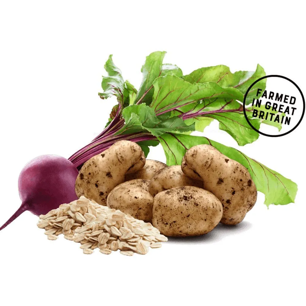 黑水虻幼蟲41.5%(昆蟲粉28%,新鮮昆蟲8%,昆蟲油5.5%)、紅薯(23%)、馬鈴薯(20%)、甜菜渣(5%)、礦物質、蔬菜高湯、亞麻籽、啤酒酵母、海藻粉(0.5%)、菊苣根萃取物(益生元FOS的來源)(0.1%)、軟骨素(500毫克/公斤)、脫水菠菜(0.05%)、脫水藍莓(0.05%)、脫水胡蘿蔔、脫水蕁麻、脫水歐芹、脫水迷迭香、薑黃(0.005%)、脫水綠薄荷。 - 營養分析