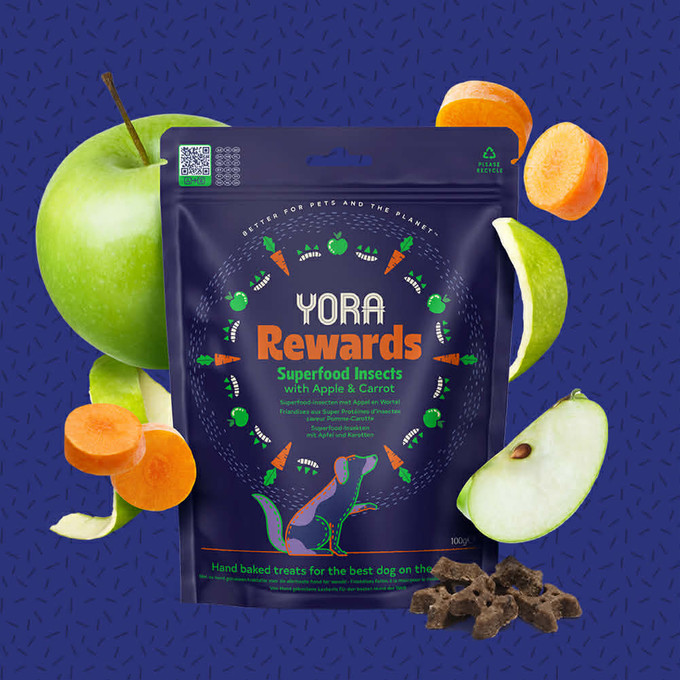 脫水昆蟲蛋白(黑水虻幼蟲25%)、燕麥、鷹嘴豆粉、植物甘油、昆蟲油(黑水虻幼蟲)、脫水胡蘿蔔 (2%)、脫水蘋果 (2%)、木質纖維素、礦物質。