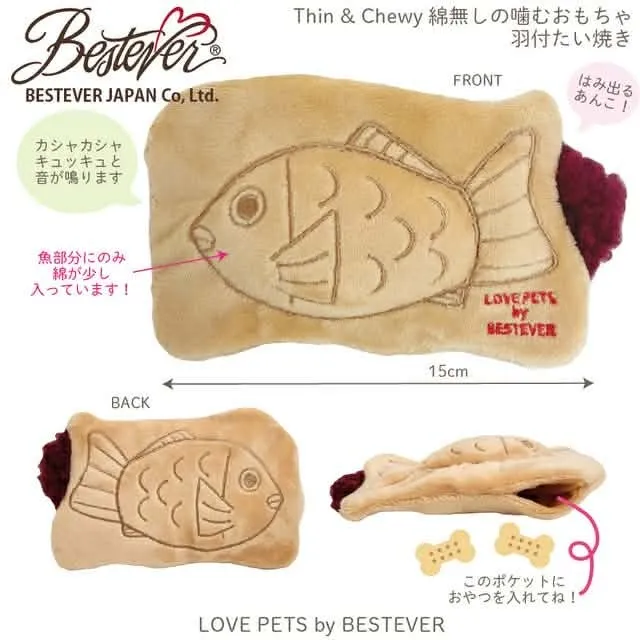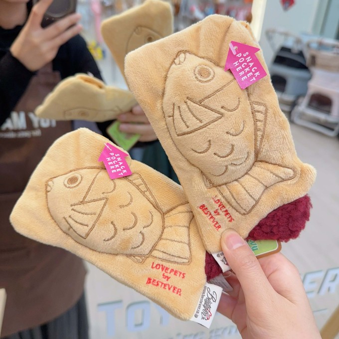 from Japan 日本 Bestever 品牌約15*9*3cm扁扁一個鯛魚燒重點是他雙面都有烙印造型喔刺繡非常漂亮 有一個treat pocket小口袋可以藏食放飼料凍乾小塊肉肉都適合響紙+啾啾紅豆餡露出來超級可愛